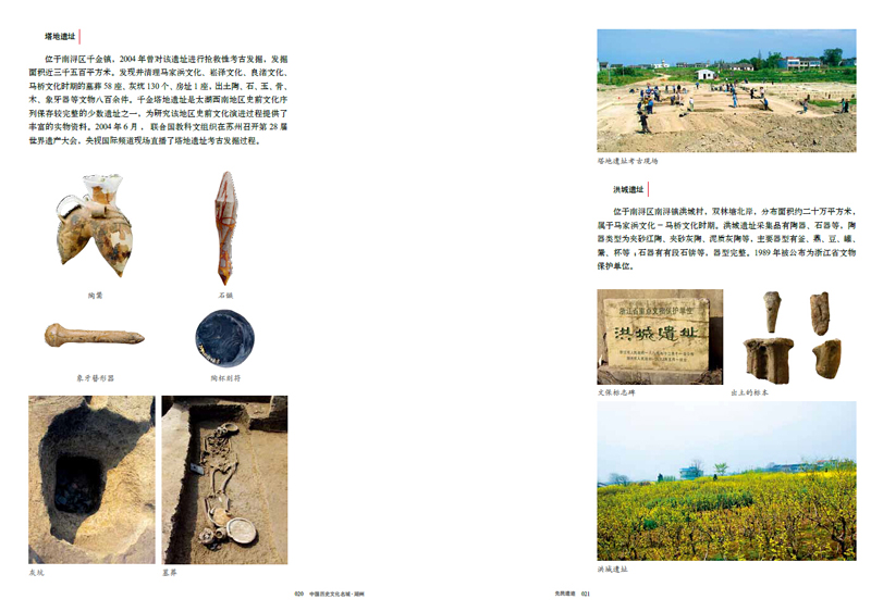 洪城遗址 位于南浔区南浔镇洪城村,双林塘北岸,分布面积约二十万平方米,属于马家浜文化-马桥文化时期。洪城遗址采集品有陶器、石器等,陶器类型为夹砂红陶、夹砂灰陶、泥质灰陶等,主要器型有釜、鼎、豆、罐、鬶、杯等;石器有有段石锛等,器型完整。1989年被公布为浙江省文物保护单位。(来源:《中国历史文化名城湖州》)