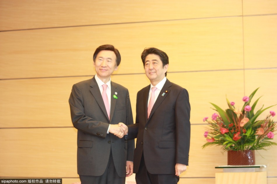 当地时间2015年6月22日,日本东京,正值日韩邦交正常化50周年纪念,日本首相安倍晋三在东京会见了韩国外长尹炳世,进行了短暂交谈,期间尹炳世还赠送给安倍其父亲安倍晋太郎的照片。(供图:希帕)