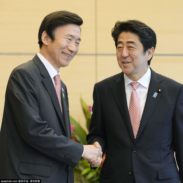 当地时间2015年6月22日,日本东京,正值日韩邦交正常化50周年纪念,日本首相安倍晋三在东京会见了韩国外长尹炳世,进行了短暂交谈,期间尹炳世还赠送给安倍其父亲安倍晋太郎的照片。(供图:希帕)