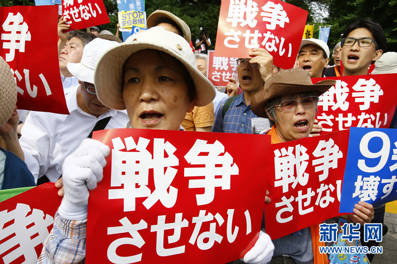 图为6月14日,在日本东京国会前,示威者手举反战标语参加集会。图片来源:新华/美联
