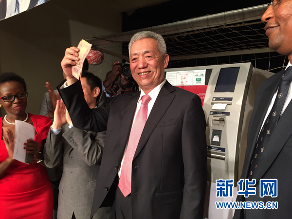 中国驻卢旺达大使沈永祥在启动仪式现场试用银联卡取现金,顺利取出卢旺达卢郎。新华社记者 杨孟曦摄