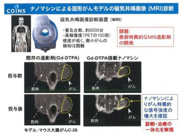 在磁共振成像中,钆(gadolinium)被作为造影剂,以更清晰地拍摄到血管,但是向钆照射中子射线时,钆就会释放出攻击癌细胞的伽马射线。研究小组着眼于这一点,利用作为骨骼主要成分的磷酸钙来包裹钆,再在外面包裹上生物适应性很强的分子,制造出这种直径约55纳米(1纳米为十亿分之一米)的微小胶囊。