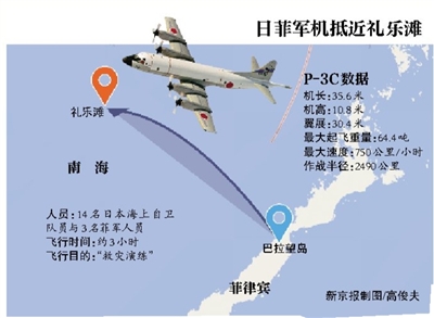 根据报道,14名日本海上自卫队员与3名菲军人员乘坐P-3C反潜机,于当地时间23日清晨6时许从菲律宾巴拉望岛普林塞萨港起飞,从大约1500米的空中抵近礼乐滩边缘。