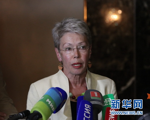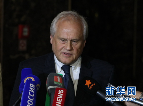 当天正式卸任的欧安组织乌克兰问题代表塔利维亚尼最后一次向媒体介绍乌克兰问题三方联络小组会议情况。新华网记者陈俊锋 摄