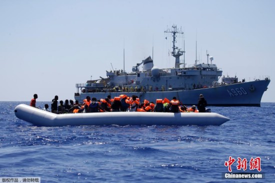 当地时间2015年6月23日,比利时海军军舰Godetia号在地中海靠近利比亚的沿岸救起数百名非法移民。