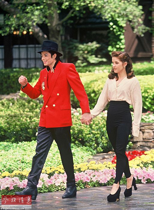 【家庭生活】他的两次婚姻都增加了人们对他怪异的感觉。他的第二次婚姻为其带来一男一女两个孩子。2002年,迈克尔·杰克逊的第三个孩子出生。因是试管婴儿,母亲的身份一直不为外界所知。图为杰克逊与当时的妻子Lisa在梦幻庄园漫步。