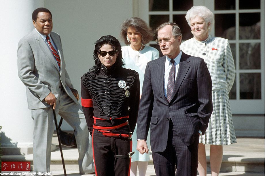 【人物评价】《时代》周刊把迈克尔·杰克逊描述为一个“挽救了唱片业的拯救者,定义了一个年代音乐潮流的作曲人,拥有不可思议双脚的舞者,打破了所有喜好、风格与种族界限的歌手”。迈克尔的歌曲或展示梦想、或激发潜能、或揭穿谎言、或痛斥“黑暗”,他的内心深处,有一种渴求“平等”的力量。迈克尔·杰克逊在音乐上的贡献还有对黑人种族、美国社会和文化的贡献。图为1990年4月13日,美国前总统老布什在白宫会见迈克尔-杰克逊。(图片来源:东方IC)