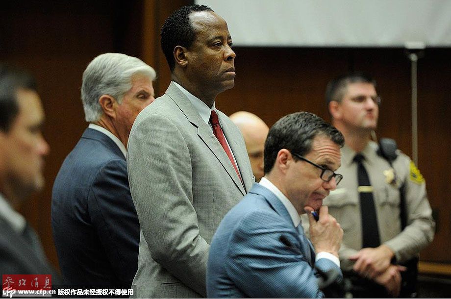 【死因】2009年,洛杉矶首席验尸官在休斯顿法庭上公布迈克尔-杰克逊的死因,称其系被注射强力麻醉剂异丙酚而导致死亡,属于他杀。图为2011年11月3日,美国洛杉矶,迈克尔·杰克逊私人医生康拉德·莫里出庭受审。美国流行天王迈克尔·杰克逊死亡案的主审法官3日令陪审团考虑做出最终裁决。此前,此案的起诉方和辩护方均已提交最后陈述。莫里涉嫌为杰克逊注射过量镇定剂导致其死亡,如果罪名成立,莫里将面临4年的牢狱执行,并被吊销行医执照。(图片来源:CFP视觉中国)