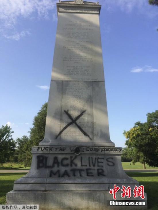 图为纪念碑一面被喷上了反种族歧视标语,还有咒骂邦联制的脏话。