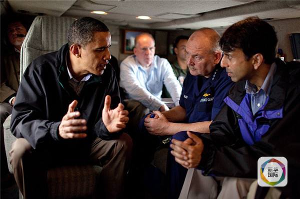 金达尔(右一)同奥巴马交谈。