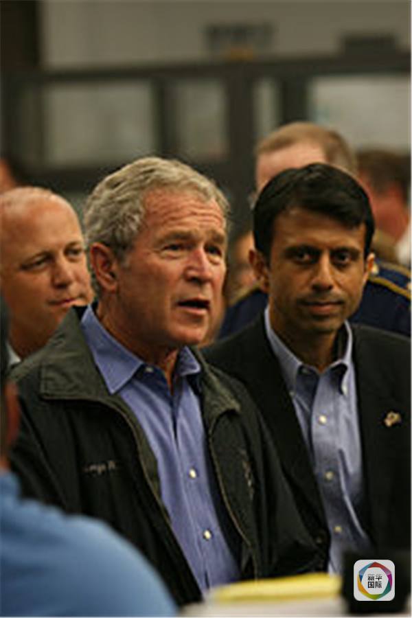 应对“古斯塔夫”飓风期间的金达尔(右一)和时任美国总统小布什