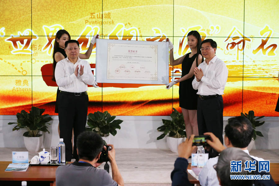 6月25日,国务院副秘书长、国务院参事室主任王仲伟(左)向湖州市市长陈伟俊(右)授予“世界丝绸之源”荣誉证书。当日,中国湖州钱山漾遗址获“世界丝绸之源”命名仪式在北京举行。来自钱山漾的两件丝绸精品同日将随“中国梦 丝路梦”互联互通丝路行考察团,跨越亚欧万里长路,亮相米兰世博会。记者 邢广利 摄