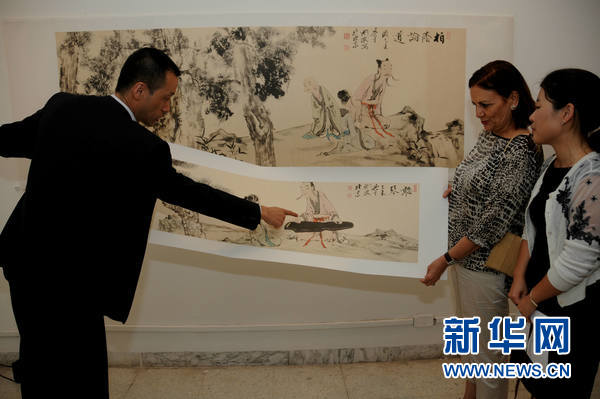 刘波向拉克达尔赠送一副自己的作品。新华社发(阿代尔摄)