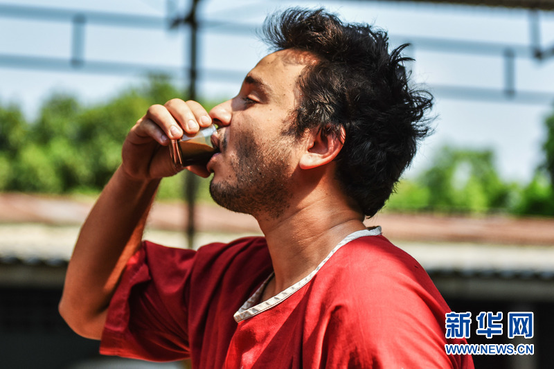 一位接受催吐排毒治疗的戒毒者服下草药汁。 新华网记者 李芒茫 摄