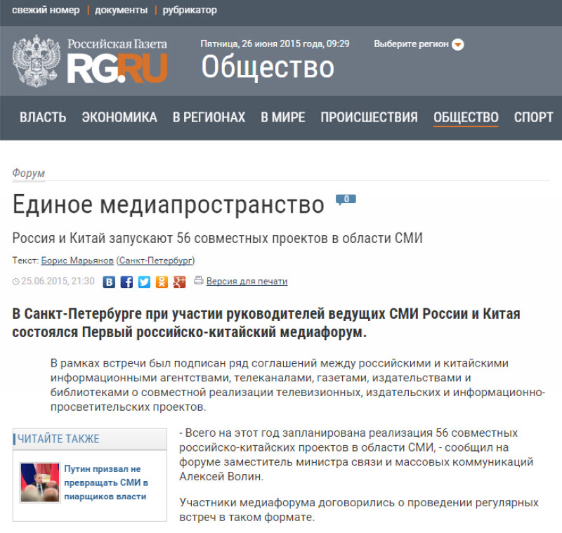 俄罗斯报:统一的传媒空间———中俄两国将实施56个媒体合作项目