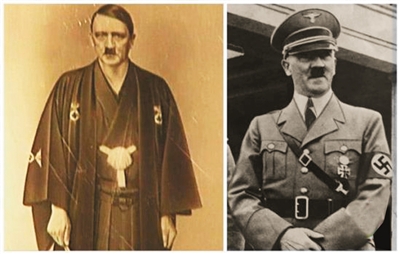 希特勒着纳粹军服与和服对比照。(图片来源:《每日快报》网站)