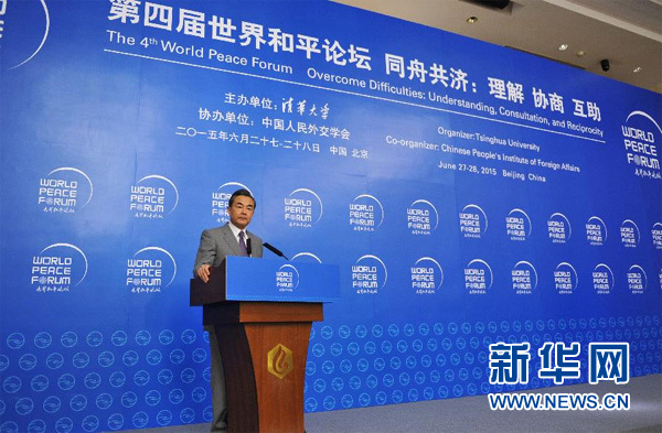 6月27日,中国外交部长王毅在北京出席第四届世界和平论坛并讲话。 新华社记者丁海涛摄