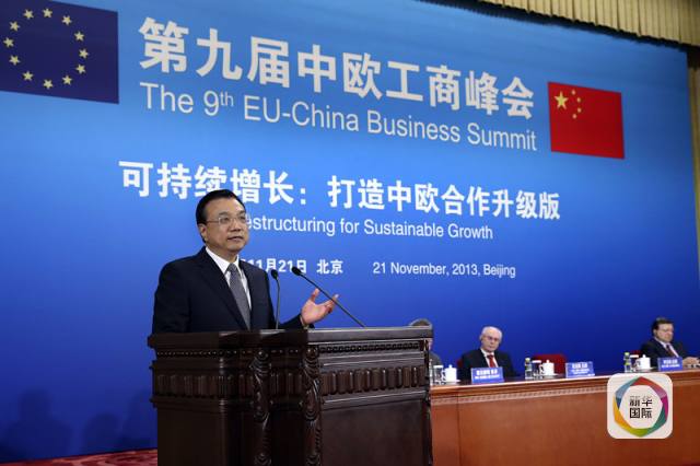 (资料图:2013年11月21日,国务院总理李克强在北京人民大会堂与时任欧洲理事会主席范龙佩、时任欧盟委员会主席巴罗佐共同出席中欧工商峰会并致辞。摄影庞兴雷。)