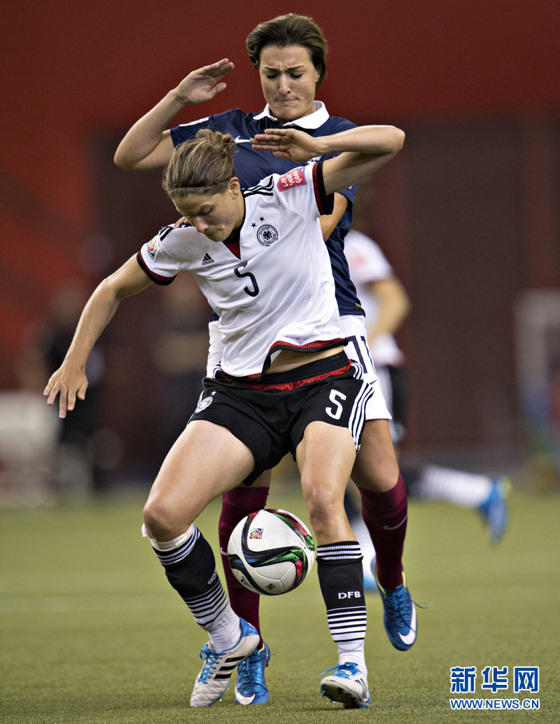 6月27日,在2015加拿大女足世界杯四分之一决赛中,德国队与法国队在120分钟的比赛中战成1比1平,德国队最终在点球大战中以5比4战胜法国队,晋级半决赛。新华社发 (安德鲁·宋 摄)