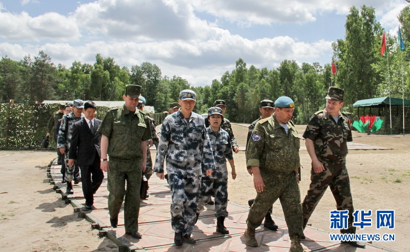 白国防部长拉夫科夫(前排右一)、白特种部队司令杰尼先科(前排右二)、中国空军副参谋长李春潮(二排左一)等在营地参观。(陈俊锋摄)