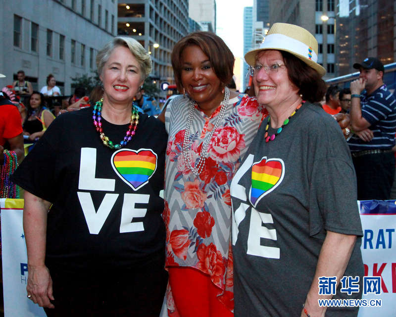 休斯敦同性恋女市长安妮丝·帕克(左)和其同性伴侣凯西·哈巴德(右)与民众合影。新华社发 (贾忠 摄)
