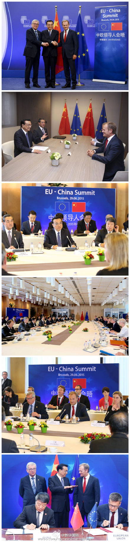 新华网北京6月30日电 据新华社“新华国际”微博报道,29日下午,第17次中欧领导人会晤在布鲁塞尔举行,李克强总理同欧洲理事会主席图斯克、欧盟委员会主席容克共同主持。会晤取得重要成果,发表了会晤联合声明和关于气候变化的联合声明,在科技、知识产权、区域政策、海关等领域签署多项合作文件,就广泛议题达成共识。