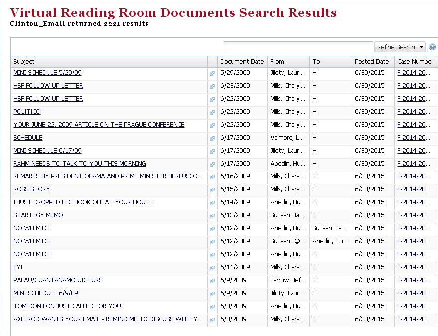 新华国际客户端在白宫官网上看到,这些电子邮件按照主题、收发日期、发件人、收件人、案件编号、公布日期等信息排列,每页显示20封。第一页中,有10封电邮的发件人是希拉里的两名前助手谢尔丽·米尔斯和杰克·沙利文。