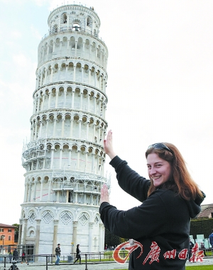 一名女子正在比萨斜塔前自拍。