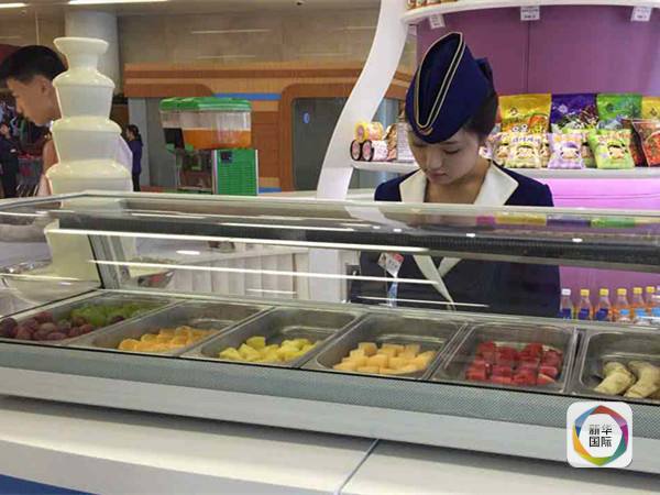 最吸引记者的,莫过于甜品店。虽然面积不大,只有吧台大小,但经营品种丰富,从各类你想到或想不到的西式糕点到咖啡、茶、鸡尾酒等应有尽有。服务员金明元告诉新华国际客户端,他曾专门到德国接受2个月的培训。从他举手投足中,记者能感受到他服务的专业化和在新航站楼工作的满足感。