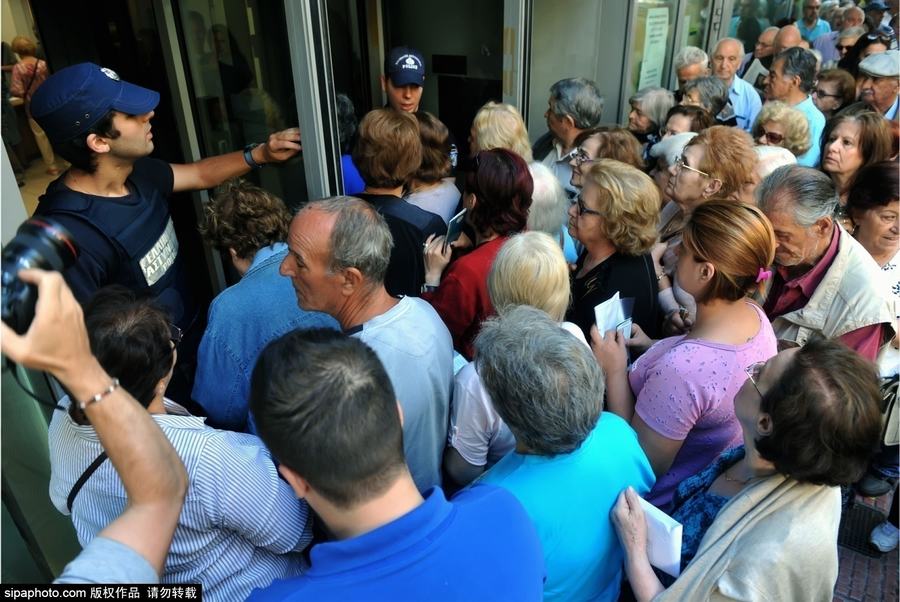 当地时间2015年7月1日,希腊,自希腊实施资本管治的第三天,全国约三分之一银行1日重开,为长者发放退休金。国家银行分行只对养老金领取者开放,全国各地民众排队等待领取养老金。(图片来源:SIPA)
