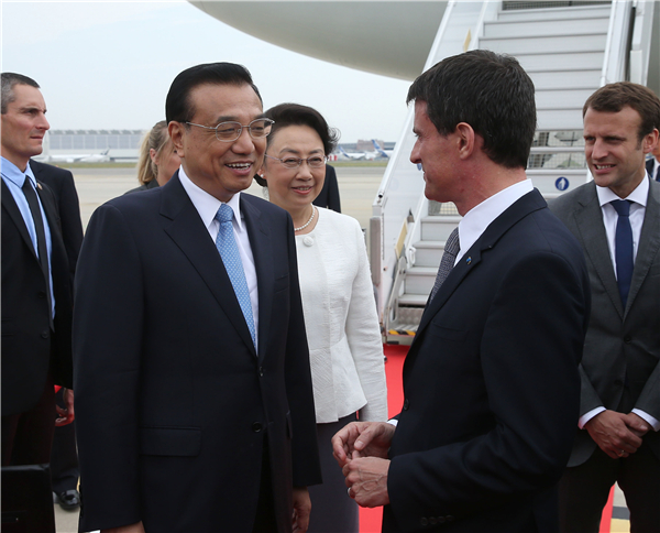 7月2日,国务院总理李克强抵达图卢兹,法国总理瓦尔斯专程到机场迎候。新华社记者庞兴雷摄