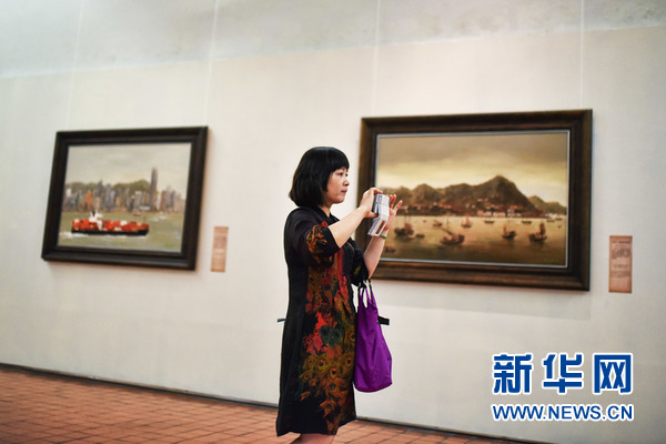 7月3日,在位于曼谷的泰国国家美术馆,一位观众在“海上丝绸之路——冯少协油画全球巡回展”上从《今日·香港维多利亚港》(左)和《1850年·香港维多利亚港》(右)两幅画作前走过。 新华网记者 李芒茫 摄