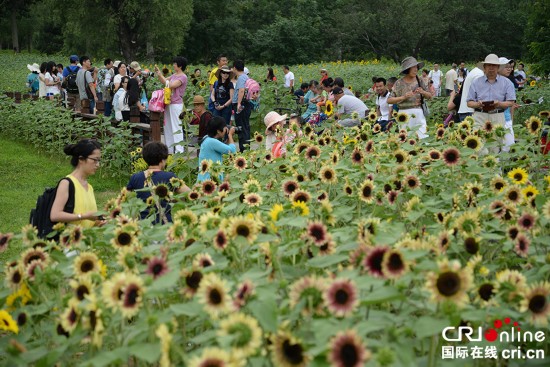 2015年7月4日,北京奥林匹克森林公园内百亩葵花竞相绽放,前来赏花的游客沉醉在金色的花海中。韩基韬 摄