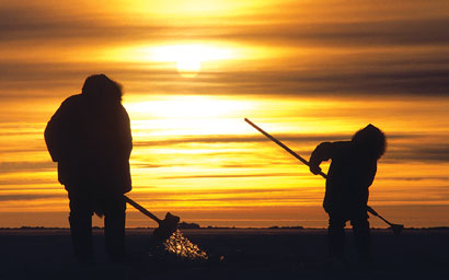 图片说明:巴罗的爱斯基摩人正在冰上打洞,营救被困冰面下的灰鲸。 东方IC