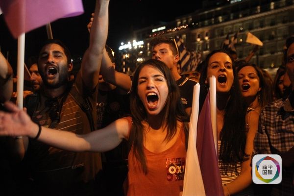 7月5日,希腊雅典,反对者获胜后高声庆祝。