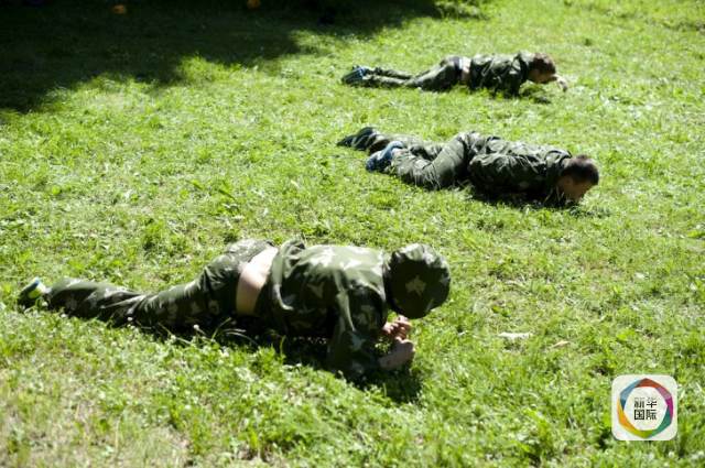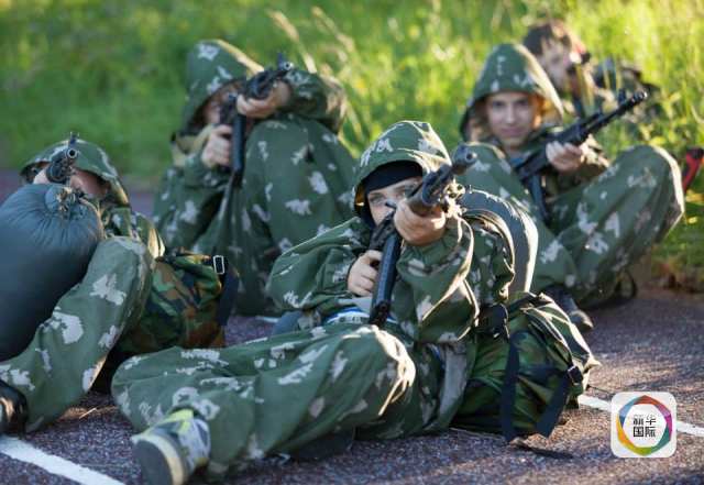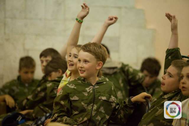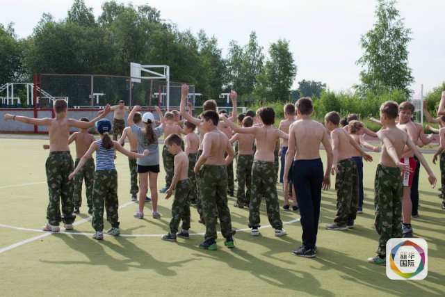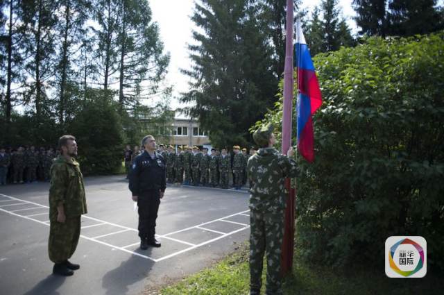 新华网北京7月6日电 据新华社“新华国际”客户端报道,早晨8点,伴着不太刺目的朝阳,一群身着迷彩服的孩子与教官一起升俄罗斯国旗,唱俄罗斯国歌,而后开始一天的军事操练。