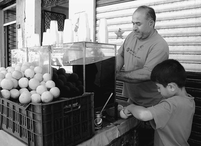 在大马士革街头的果汁摊,哈姆丹正用稚嫩的小手帮爸爸切橙子。本报记者 宦翔摄