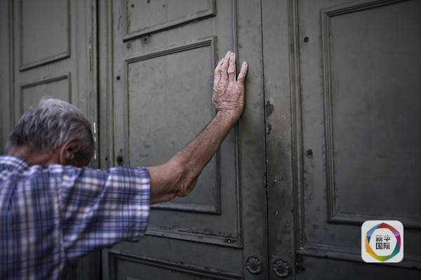 7月7日,在希腊首都雅典,一名退休老人倚靠在希腊国民银行门外等待取款,每人最多可以领取120欧元现金。图片来源:新华/法新