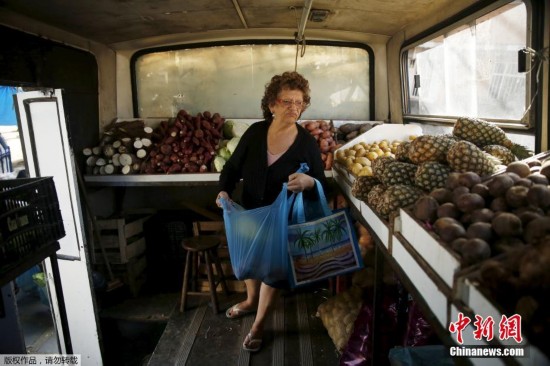 当地时间7月7日,巴西里约热内卢,一名男子开设了一家微型菜市场,水果蔬菜都搬到一辆大巴车上,市民自行上车购物。
