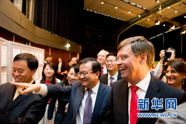 荷兰前首相巴尔克嫩德(右一)和中国银行副行长高迎欣(右二)共同观看中荷企业填写配对表的情况。新华网发