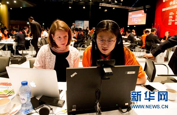7日,荷兰企业家在中荷农业中小企业洽谈会上,在现场翻译的帮助下借助电脑与中国客户进行远程视频对接。新华网发