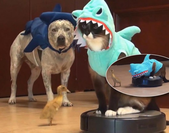 图中,小猫扮成的鲨鱼正在追逐一只鸭子。另一只小狗则扮成锤头鲨也加入其中。(网页截图)