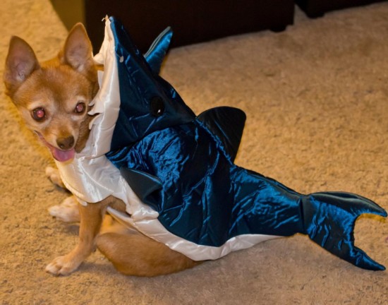 宠物狗穿上闪闪发光的鲨鱼装,变成可爱鲨鱼。(网页截图)