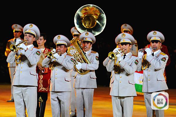 2014年8月28日,在内蒙古朱日和训练基地,来自塔吉克斯坦国防部警备团军乐团的演员在“和平使命——2014”上海合作组织成员国武装力量联合反恐军事演习军乐行进晚会上演奏。新华社记者 张领摄