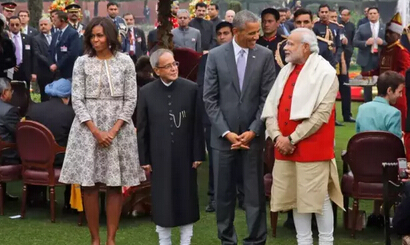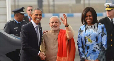 然而,这些还都不能算是莫迪最让人觉得回味十足的服装。1月26日,莫迪与奥巴马在海德拉巴宫举行会谈。当天,莫迪穿的藏蓝色立领套装一下子成为了人们关注的焦点。