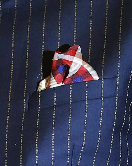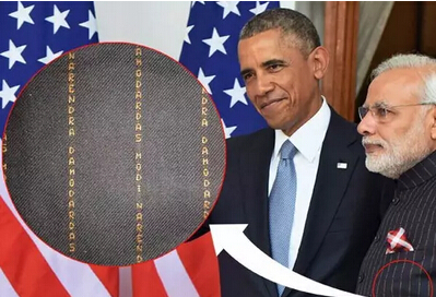 原来,那些条纹竟然是由莫迪的名字排列而成的!Narendra Damodardas Modi这几个字母被用金线织入藏蓝色的布料中,密密麻麻地排列成行,让人远远看上去只是普通的牙签纹一样。
