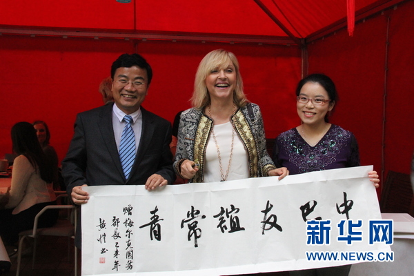 中国驻德国慕尼黑总领馆9日晚举办“领馆长夜”活动,巴伐利亚州欧洲事务部长梅尔克(中)及领区当地民众、媒体记者、华侨华人等数百人出席。此次“领馆长夜”活动由巴州政府与领团联合主办,领区内共有30个国家的领事代表机构参加,梅尔克将中国驻慕尼黑总领馆作为她巡访此次“领馆长夜”活动的首站。在中国驻慕尼黑总领事朱万金(左)的陪同下,梅尔克兴致勃勃地观看了中国书法展示,书法家现场为其书写了“中巴友谊长青”的横幅。新华社记者 宋国城摄