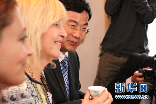 中国驻慕尼黑总领馆还邀请了慕尼黑孔子学院参与活动,现场进行茶艺展示,并请来宾们品尝正宗的中国茶。新华社记者 宋国城摄