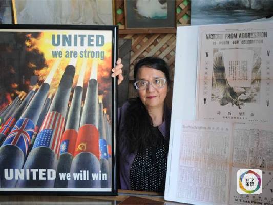 (图为旧金山美国华人收藏协会秘书长招思虹及其准备的展品。)