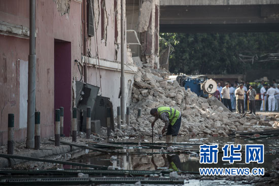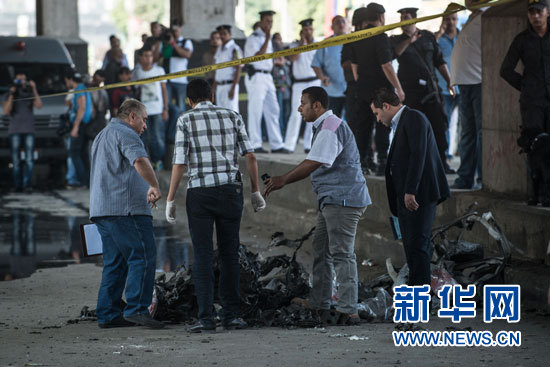 7月11日,在埃及首都开罗的意大利领馆前,工作人员在爆炸现场附近勘查。据外电报道,位于埃及开罗的意大利领馆前11日发生爆炸。 新华社记者潘超越摄